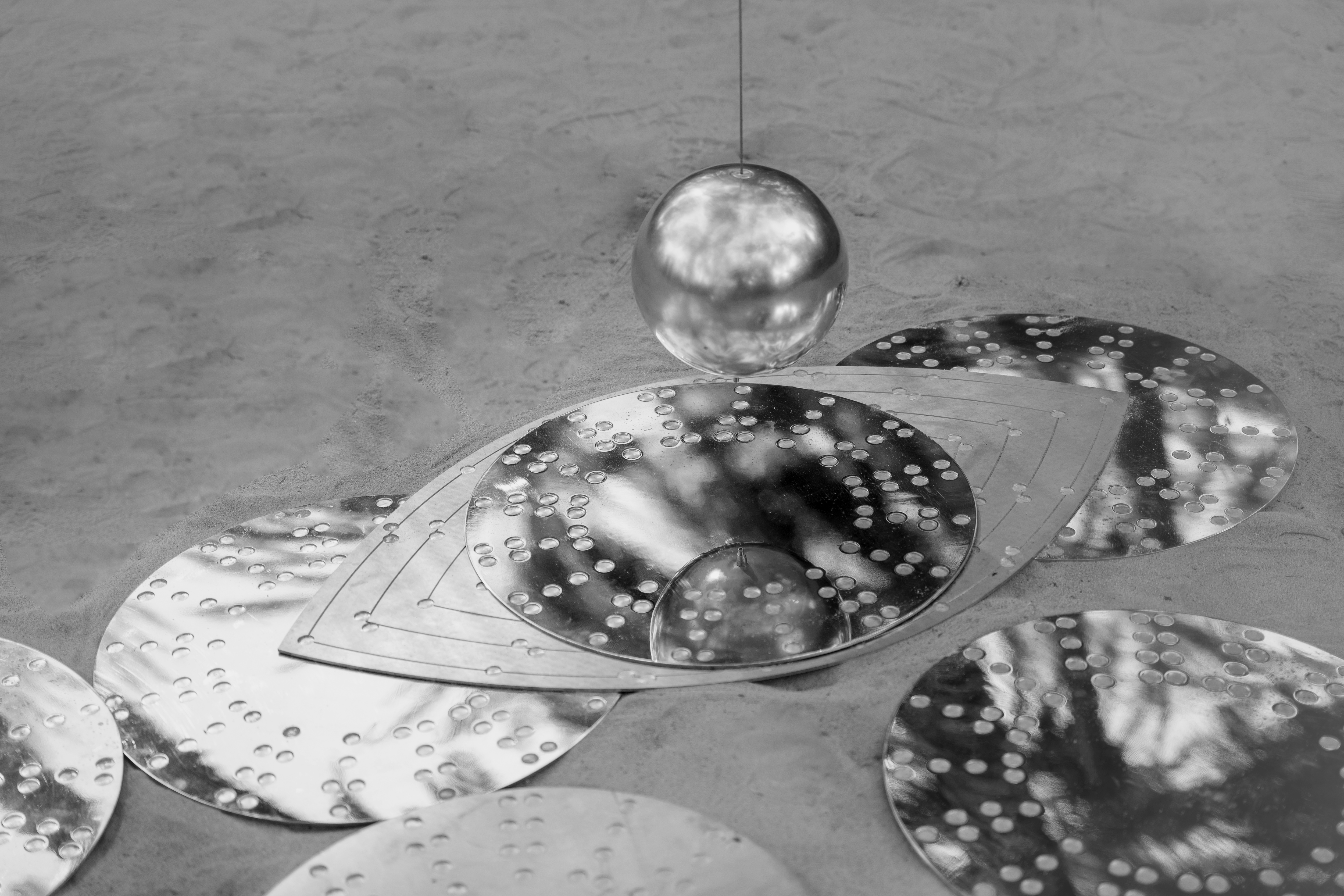 The installation presented in the palm grove is an interactive work and a delicate instrument which makes it possible to disperse sand on the ground with each participant’s gesture. The public is invited to set the brass pendulum in motion: the resulting movement differs with the subtleties of each person position, as well as the delineation that forms on the engraved plates, also in brass, laying in the sands below. The various trails, which sometimes take the form of eyes, oblong geometries, and lines, and the dot-shaped inscriptions that appear within them, are inspired by a remarkable 13th-century geomantic device used to decipher the positions of grains of sand thrown at random and thus deduce answers to specific questions put by the geomancer. The pendulum is a mathematical instrument with calculable rotations but set in sway by the individual a reflection is made on the agency and uniqueness of the individual and their question. The falling sand references the passage of time. On several dials, clusters of dots allow the findings to be interpreted by applying them to different aspects of daily life, cardinal directions, colors, and constellations. The artist was inspired by the same design to create a monumental work, modified, which, this time, invites the public to become both actor and interpreter of a reading-in-progress.