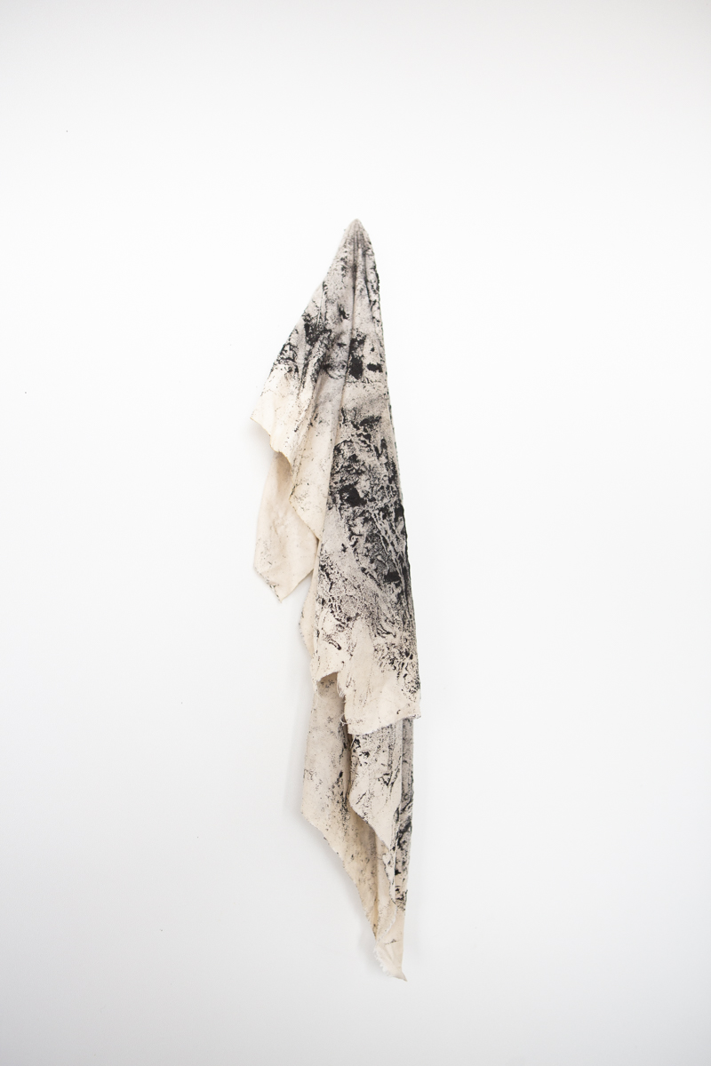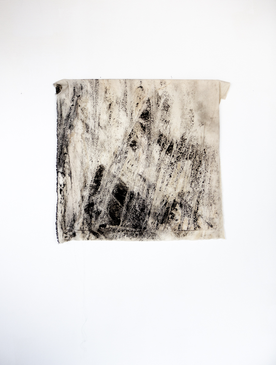 Au centre de la pièce, un long voile blanc forme comme une tente, un fragile abri dont les drapés sensuels sont ourlés d’un trait de noir. La poussière a coagulé en fines ridules dans les replis du tissu. Elle y creuse des ravinements géologiques. Les ruissèlements tracent le réseau de leurs affluents pluviaires. L’érosion s’y donne en spectacle dans la blancheur du texte comme aux flancs d’un massif volcanique.