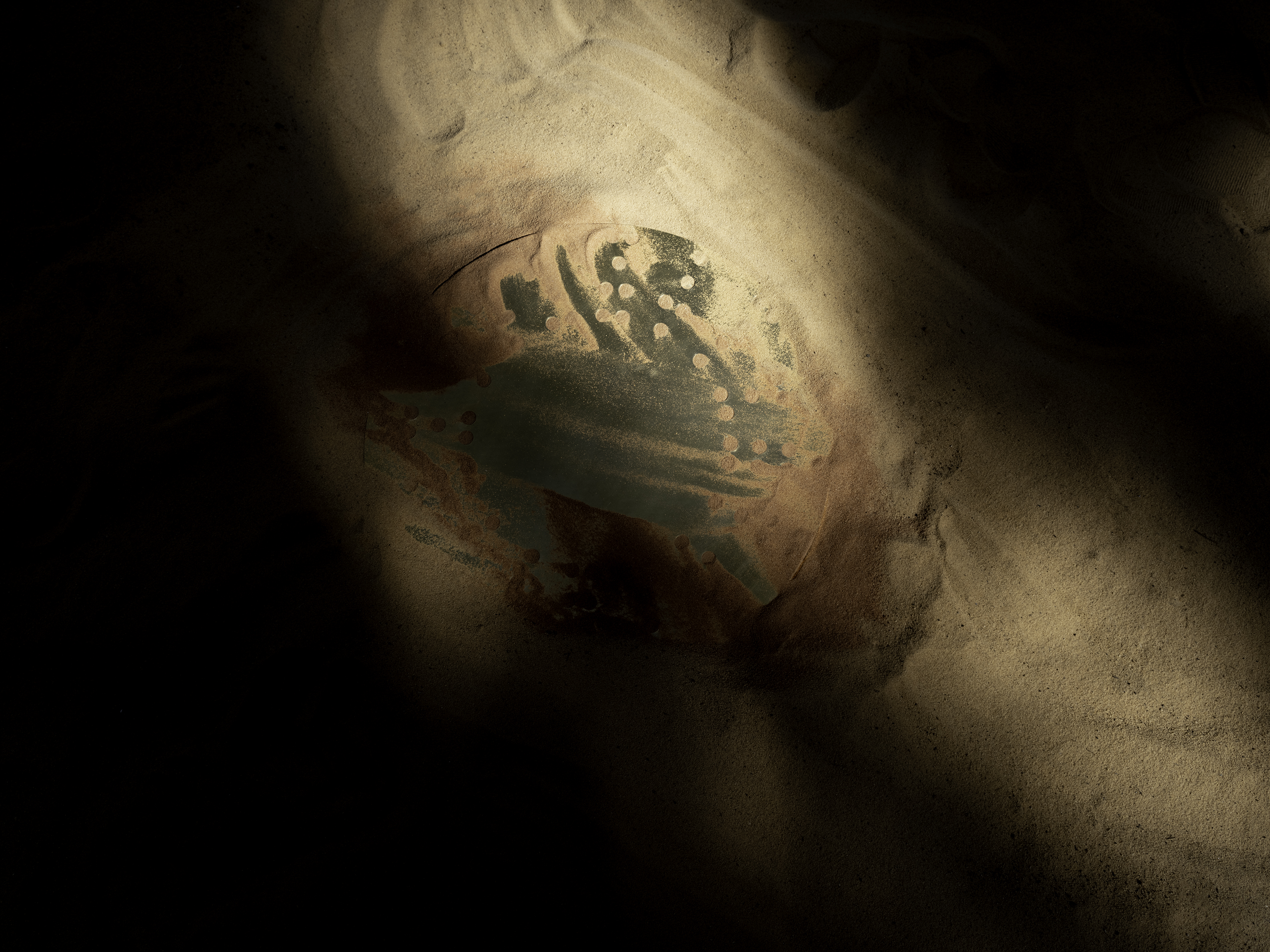 Brass discs based on wheel mechanisms of a divination machine submerged in sands of the center of the Oasis, Al-Ula, 2022.